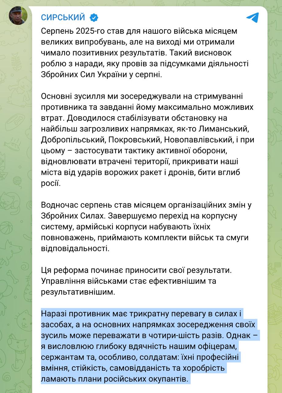 Также Сырский заявил, что в августе украинская армия сосредоточилась на сдерживании врага и нанесении ему максимальных потерь. РФ не удалось реализовать планы наступления у Покровска и на Запорожье. ВСУ освободили 58 км², нанеся удары вглубь России, а дроны поразили более 67 тысяч целей. За месяц Россия потеряла почти 29 тысяч человек, с начала года — около 297 тысяч.