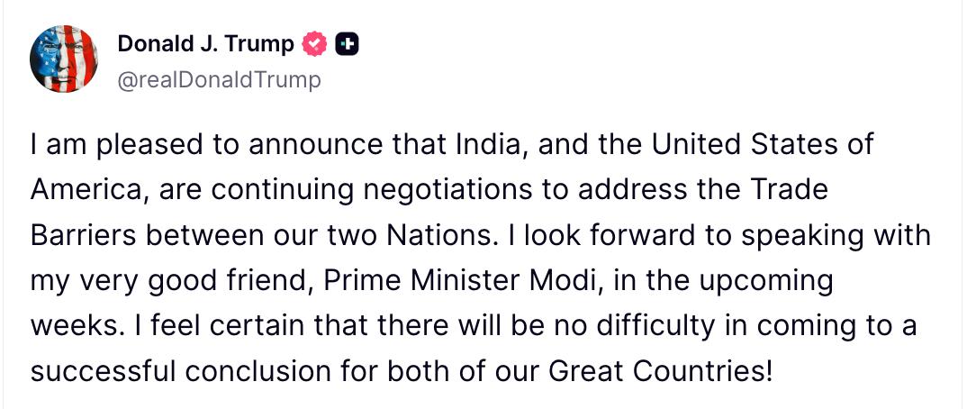 "С нетерпением жду разговора со своим очень хорошим другом, премьер-министром Моди, в ближайшие недели. Уверен, что не возникнет никаких трудностей в достижении успешного заключения, выгодного для обеих наших Великих стран", - написал президент США.
