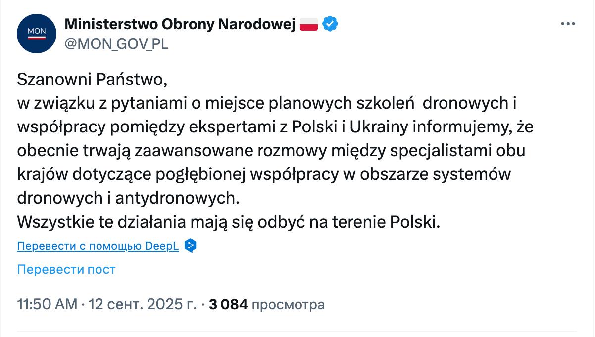 "В связи с вопросами о месте проведения запланированных тренингов по дронам и сотрудничестве между экспертами из Польши и Украины сообщаем, что в настоящее время ведутся активные переговоры между специалистами обеих стран о расширении сотрудничества в области дронных и антидронных систем. Все эти мероприятия должны пройти на территории Польши", - говорится в сообщении.