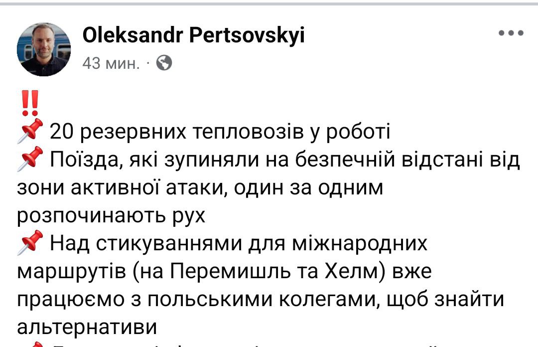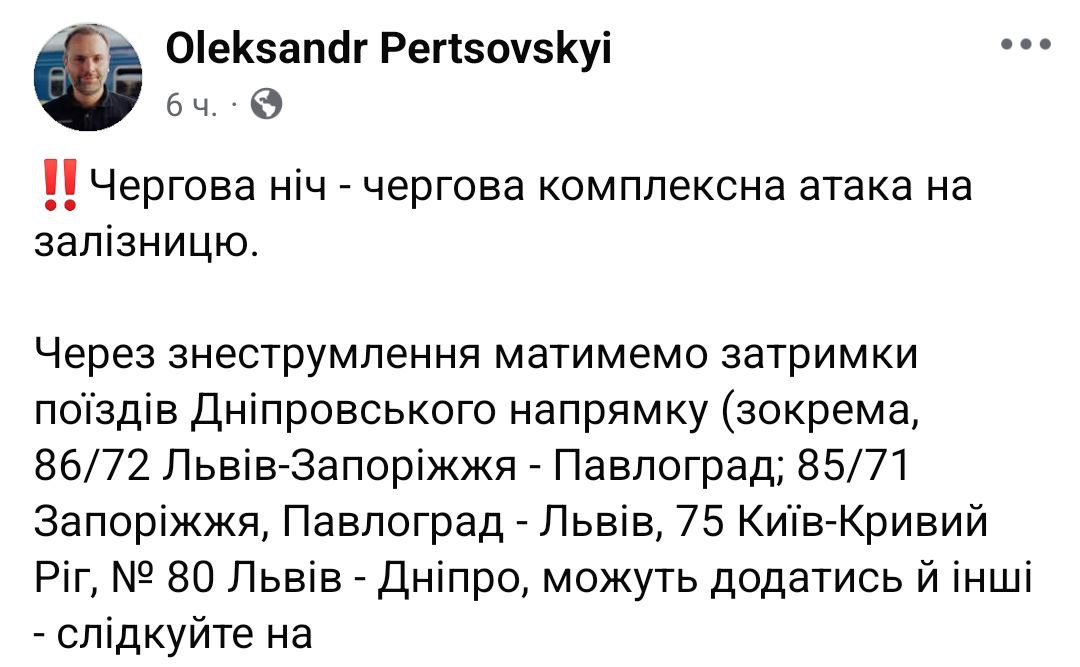Судя по сообщению, основной удар был в районе станции Знаменка Кировоградской области - отменены или сокращены поезда, которые через неё идут.