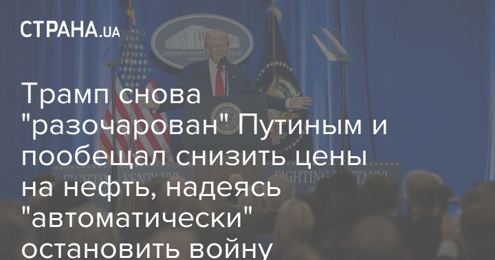 Президент США Дональд Трамп снова заявил о "разочаровании" российским главрй Владимиром Путиным и пообещал снижать цены на нефть. Таким образом он надеется "автоматически" остановить войну в Украине.