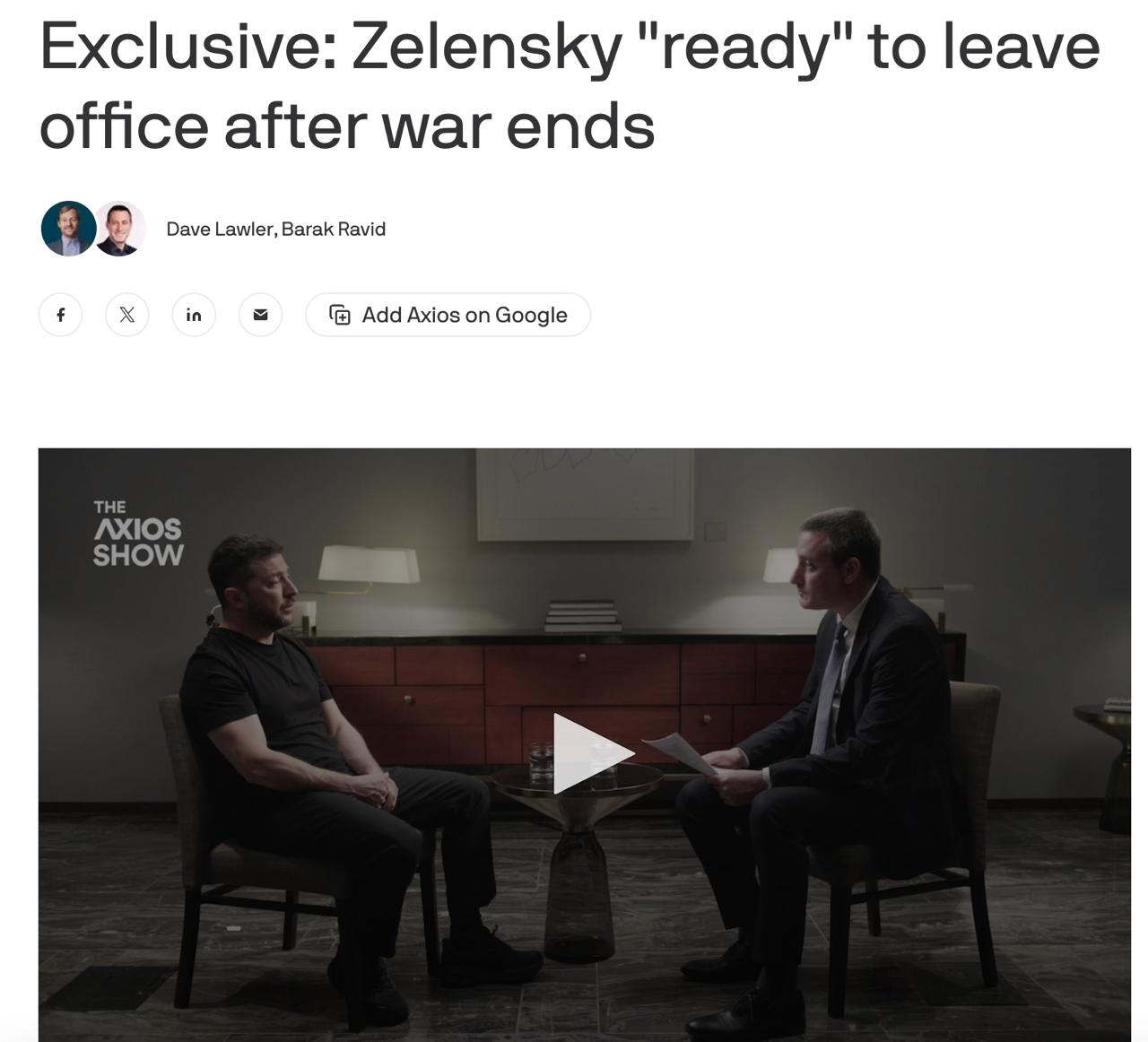 На вопрос, будет ли он считать свою работу законченной, когда война остановится, Зеленский сказал, что будет готов уйти в отставку. По его словам, его цель — закончить войну. При этом он "понимает", что люди могут хотеть "лидера с новым мандатом" для принятия судьбоносных решений, необходимых для достижения долгосрочного мира.