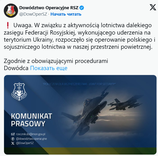 Об этом сообщили в Оперативном командовании вооружённых сил Польши.