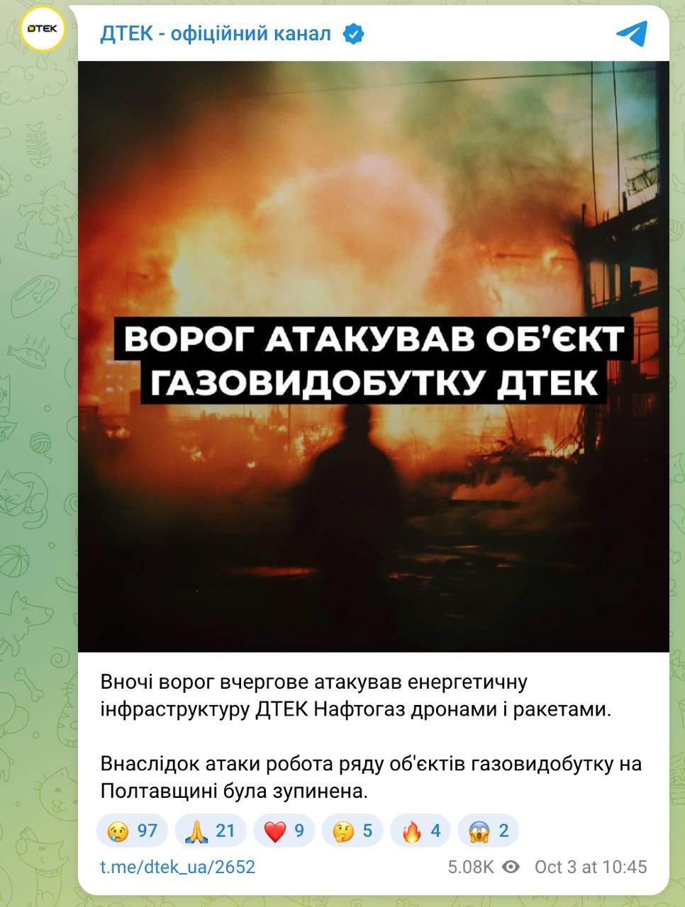 Также, по информации ДТЭК, в Полтавской области остановлена работа некоторых объектов газодобычи в результате ночных обстрелов.