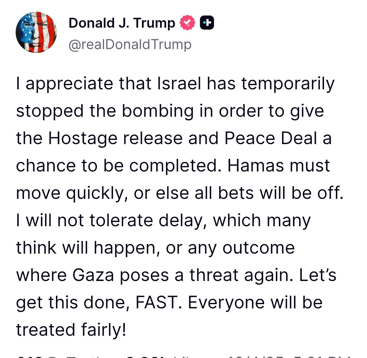 "Я приветствую то, что Израиль временно приостановил бомбардировки, чтобы дать шанс завершиться освобождению заложников и мирному соглашению. ХАМАС должен действовать быстро, иначе все шансы пропадут. Я не допущу задержек, которых, по мнению многих, можно ожидать, а также любого исхода, при котором сектор Газа снова будет представлять угрозу. Давайте сделаем это быстро. Ко всем отнесутся справедливо", - написал президент США в своей соцсети.