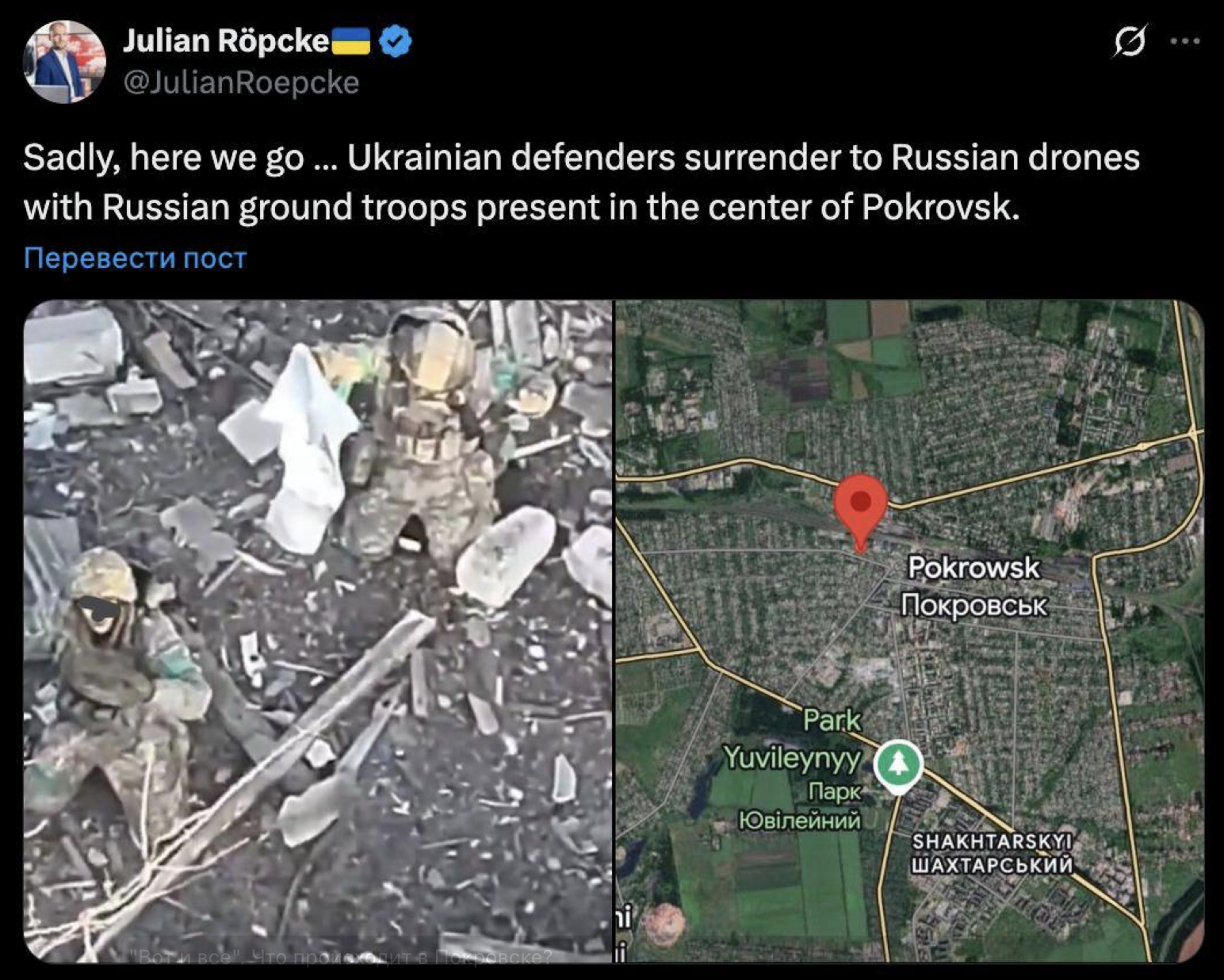 В пятницу, 17 октября, военный обозреватель Bild заявил, что россияне уже вошли в центр Покровска, а их дроны берут в плен украинских военных. "Ну, вот и все, к сожалению", - написал Юлиан Рёпке и опубликовал кадр из видео, где солдаты ВСУ стоят на коленях, сдаваясь в плен.