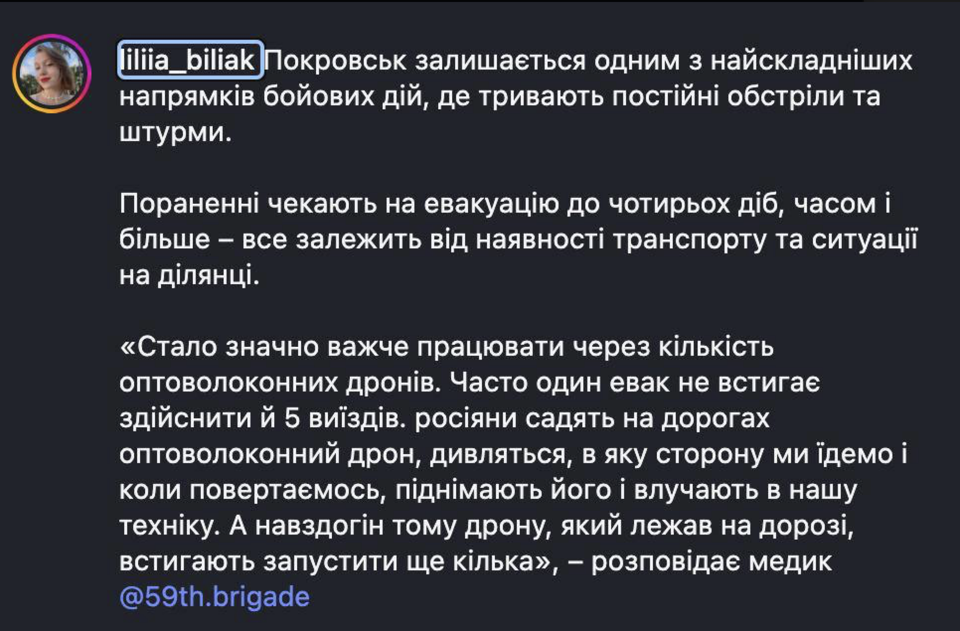"Стало значительно труднее работать из-за количества волоконно-оптических дронов. Часто одна эвакуационная машина не успевает совершить и пяти выездов. Россияне устанавливают на дорогах оптоволоконный дрон, наблюдают, в каком направлении мы едем и когда возвращаемся, поднимают его и поражают нашу технику. А вслед за тем дроном, который лежал на дороге, успевают запустить ещё несколько", - пишет Беляк со слов медика.