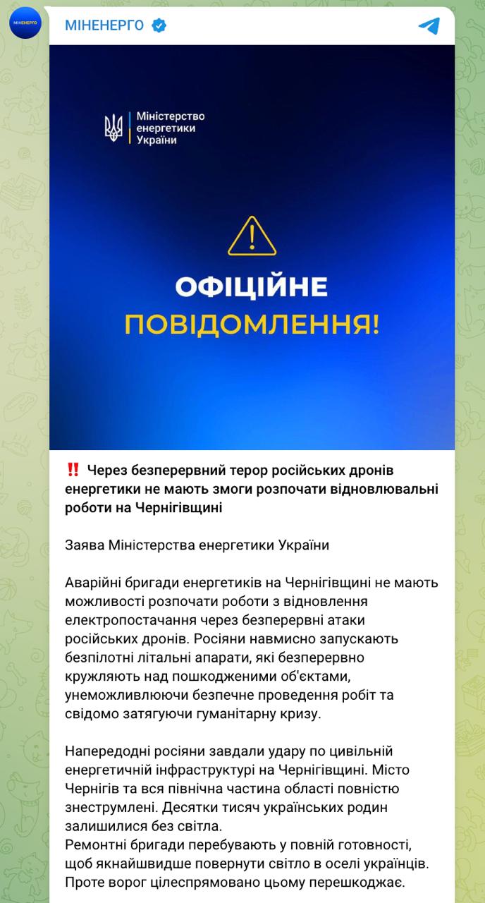 10.52 Блэкаут в Чернигове и области затягивается, потому что российские дроны не дают провести ремонт, заявляет Минэнерго.