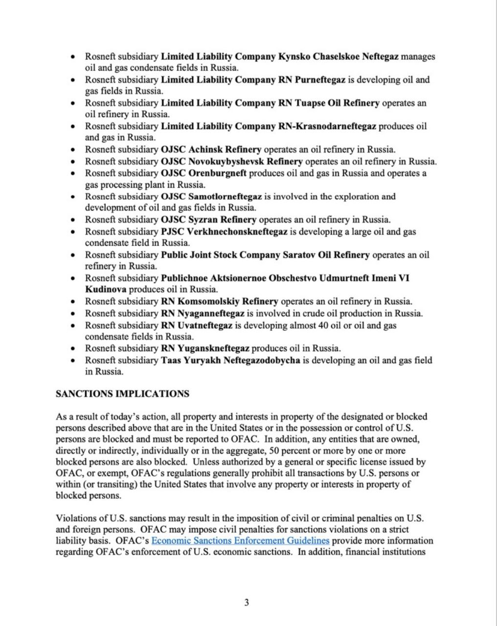 Новые ограничения США охватывают не только головные компании, но и все их дочерние структуры, где "Роснефть" или "Лукойл" владеют пятьюдесятью процентами и более.