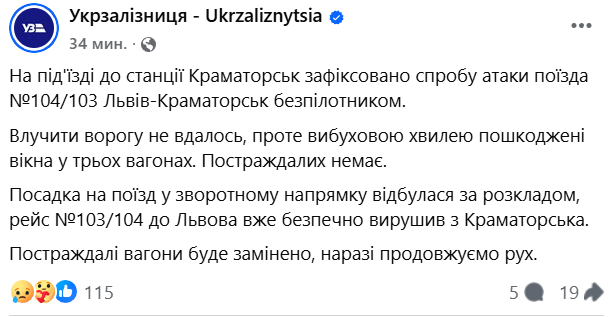 По данным перевозчика, на подъезде к станции Краматорск была зафиксирована попытка войск РФ атаковать поезда Львов–Краматорск с использованием ударного дрона.