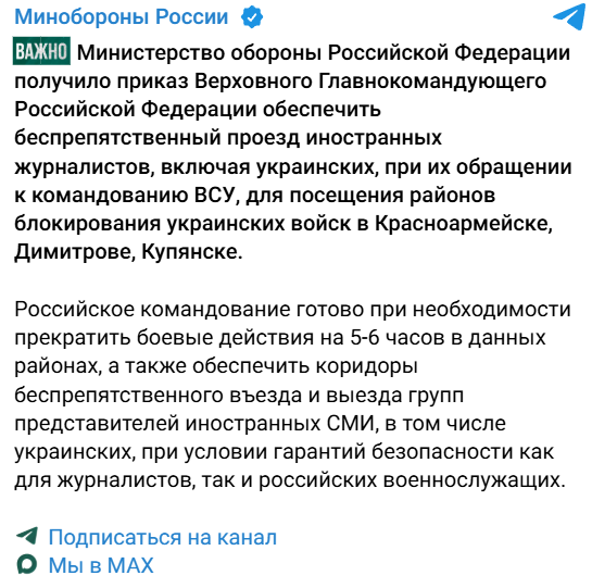 Как отметили в ведомстве, Москва готова временно приостановить боевые действия для безопасного доступа и последующего выезда журналистов.