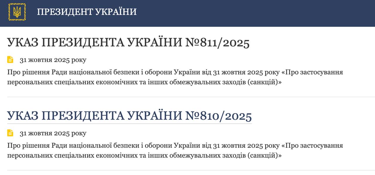 Президент Украины Владимир Зеленский подписал два указа о введении в действие решений Совета национальной безопасности и обороны Украины о применении персональных, специальных экономических и других ограничительных мер.