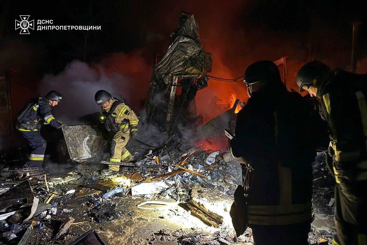 Как сообщает ГСЧС, в Марганце погиб мужчина, еще двое местных жителей получили травмы. В Самарском районе в результате попадания загорелся магазин, пожар тушат спасатели, сообщается о погибших и пострадавших.