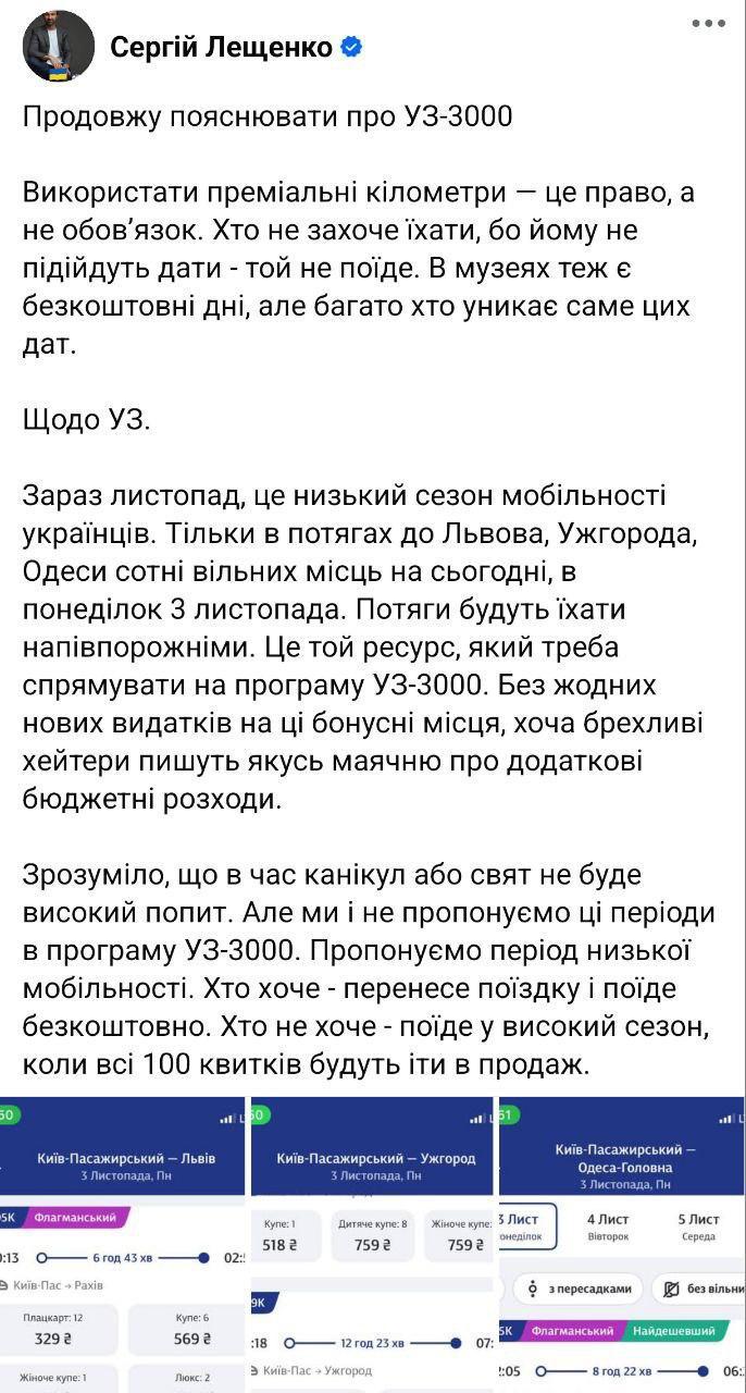 "Сейчас ноябрь, это низкий сезон мобильности украинцев. Только в поездах во Львов, Ужгород, Одессу сотни свободных мест на сегодня. Поезда будут ехать полупустыми. Это тот ресурс, который нужно направить на программу "У3-3000". Без всяких новых расходов на эти бонусные места. Понятно, что во время каникул или праздников будет высокий спрос. Но мы и не предлагаем эти периоды. Предлагаем период низкой мобильности", - объяснил Лещенко.
