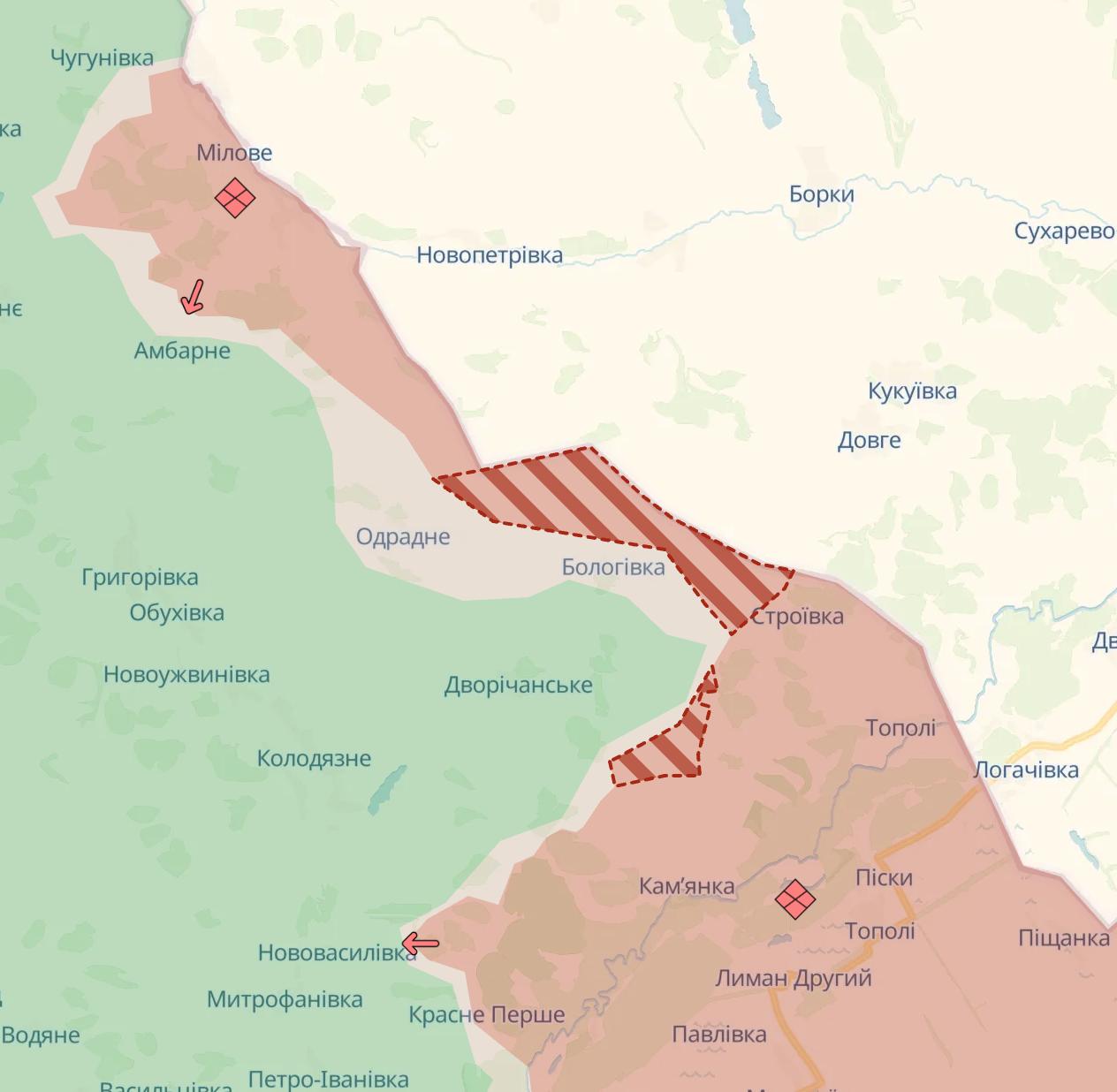 12.39 Армия РФ продвинулась в Днепропетровской области южнее Покровского и на границе Харьковской области, соединив свой плацдарм в Меловом с основными захваченными территориями, сообщает Deep State.
