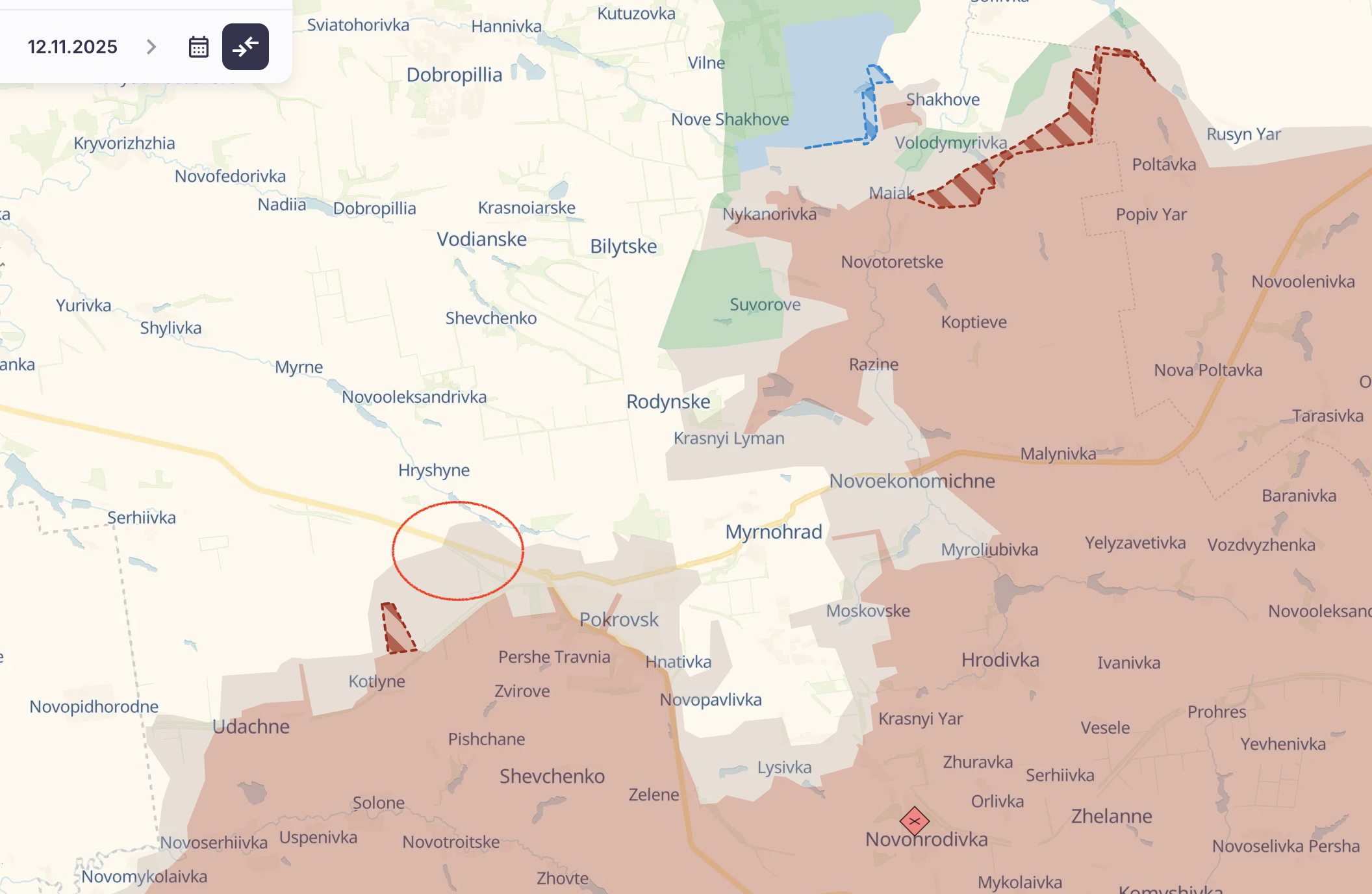 Во-первых, со стороны Котлино на запад от Покровска. Также "серая зона" расширилась в сторону Гришино, ключевой базы ВСУ к западу от города, от которой бои идут в двух километрах.