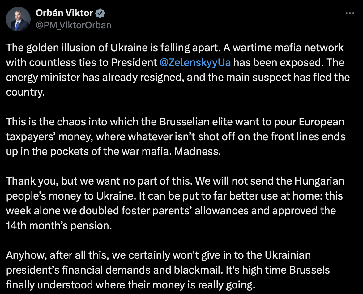 "Золотая иллюзия Украины рушится. Разоблачена военная мафиозная сеть, имеющая бесчисленные связи с президентом Зеленским. Министр энергетики уже ушла в отставку, а главный подозреваемый сбежал из страны. Именно в этот хаос брюссельская элита хочет влить деньги европейских налогоплательщиков — туда, где всё, что не сгорает на фронте, оказывается в карманах военной мафии. Безумие. Спасибо, но мы не хотим иметь с этим ничего общего. Мы не будем отправлять деньги венгерского народа Украине. Их можно использовать гораздо лучше у себя дома: только на этой неделе мы удвоили выплаты приёмным родителям и утвердили четырнадцатую ежемесячную пенсию. И уж тем более после всего этого мы не уступим финансовым требованиям и шантажу украинского президента. Брюсселю давно пора понять, куда на самом деле уходят их деньги", - написал премьер Венгрии.
