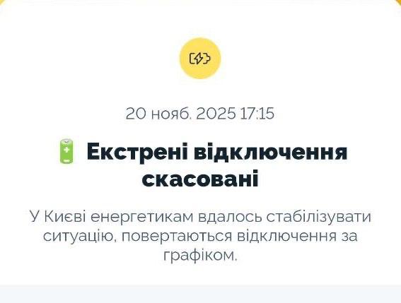 17:33 В Киеве отменены экстренные отключения света. Снова действуют графики плановых отключений.