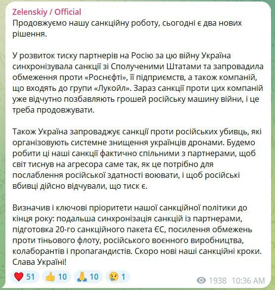 "В развитие давления партнеров на Россию за эту войну Украина синхронизировала санкции с Соединёнными Штатами и ввела ограничения против "Роснефти", её предприятий, а также компаний, входящих в группу "Лукойл". Сейчас санкции против этих компаний уже ощутимо лишают деньги российскую военную машину, и это необходимо продолжать", - пишет Зеленский.