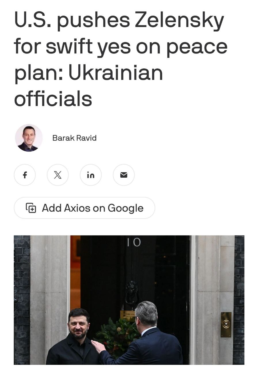 7.58 США давят на Зеленского, чтобы он принял "крупные территориальные потери и другие уступки", пишет издание Axios со ссылкой на источники.