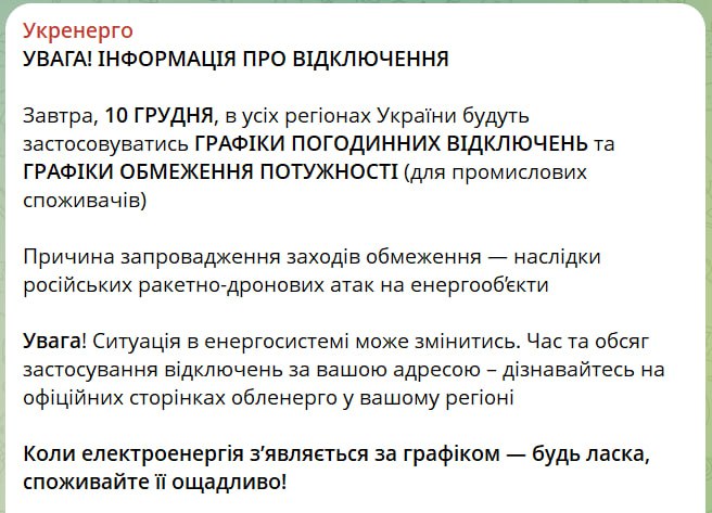 18.35 Графики отключения света завтра будут действовать по всей стране, сообщает "Укрэнерго".