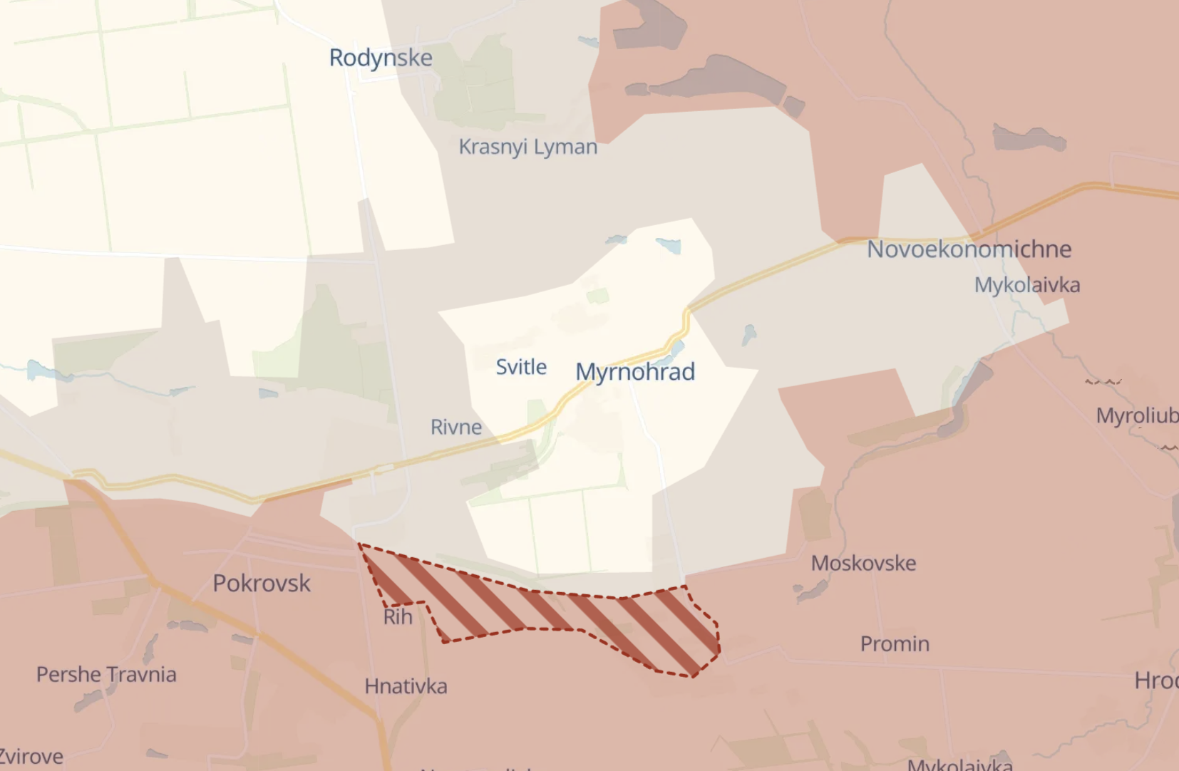 Российские войска продвинулсь к югу от Мирнограда, согласно карте военного паблика Deep State. При этом в самом городе и вокруг него увеличилась серая зона.