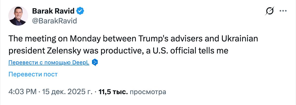 16.32 Сегодняшняя встреча Уиткоффа с Зеленским была продуктивной, пишет журналист Axios Барак Равид со ссылкой на американского чиновника.