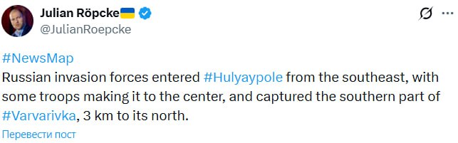Также, по его информации, россияне захватили южную часть Варваровки, расположенной в 3 км к северу от Гуляйполя.