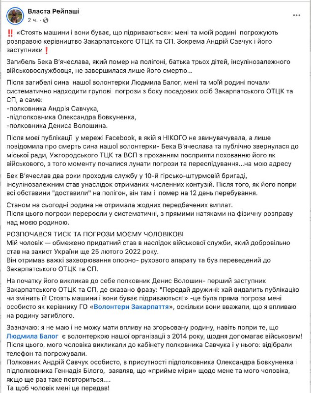 Закарпатская волонтер Власта Рейпаши заявила, что руководство областного ТЦК и СП угрожают ей лично и её семье убийством из-за публикации в сентябре сообщения о смерти на полигоне мобилизованного Вячеслава Бека, инсулинозависимого отца троих детей.