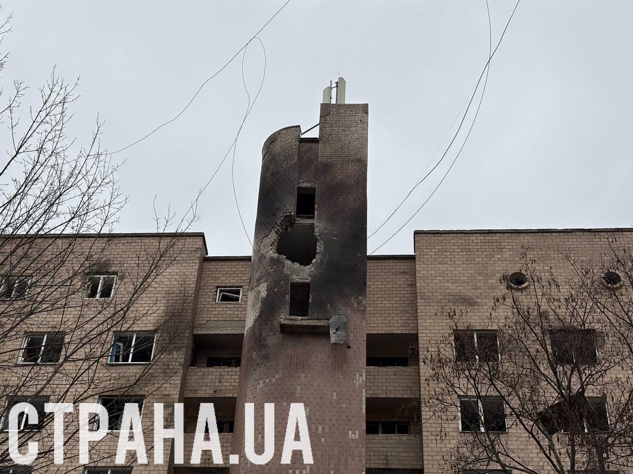 Удар пришёлся по стояку лестничной клетки. В момент попадания в общежитии находились жильцы, однако никто не пострадал.