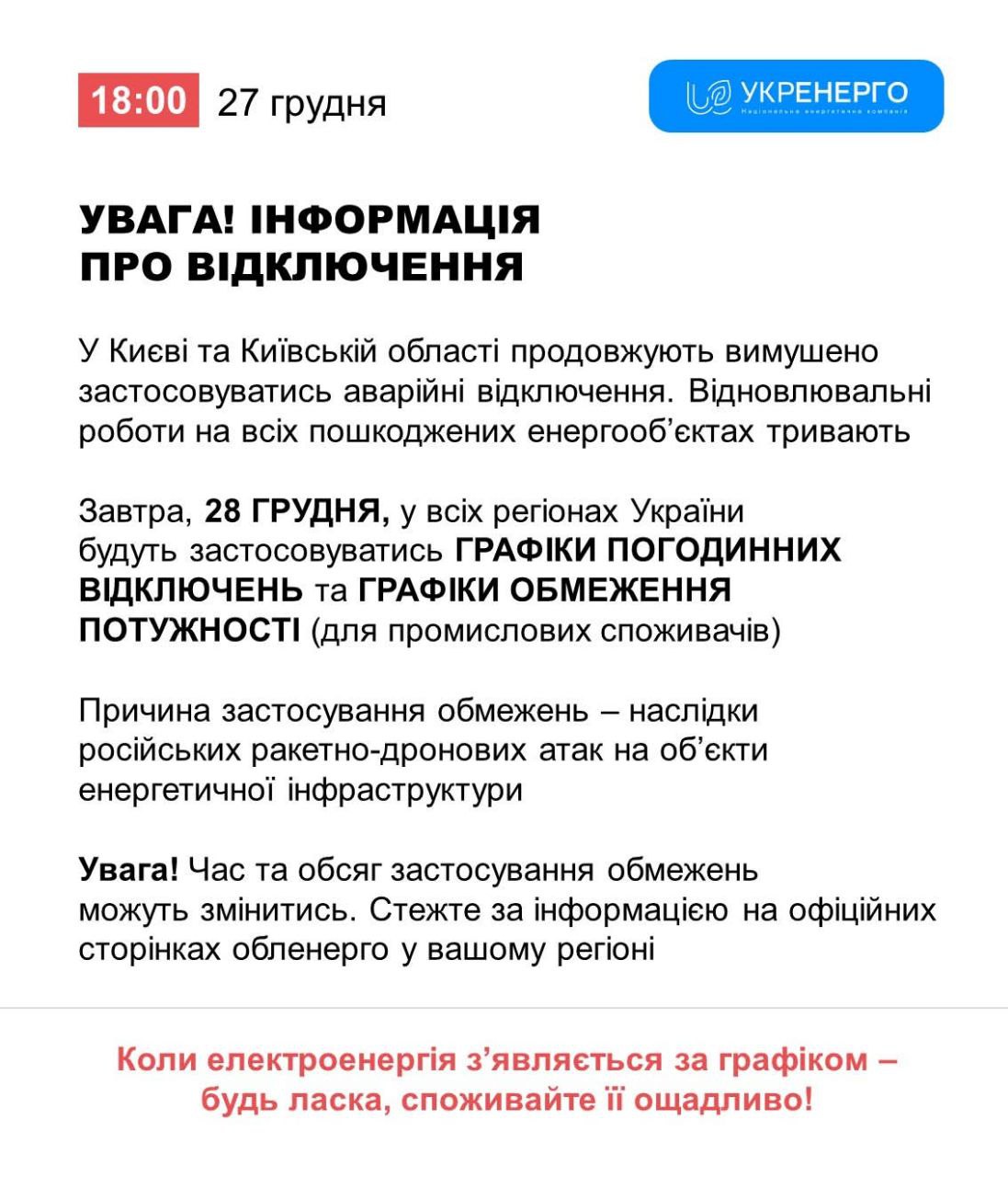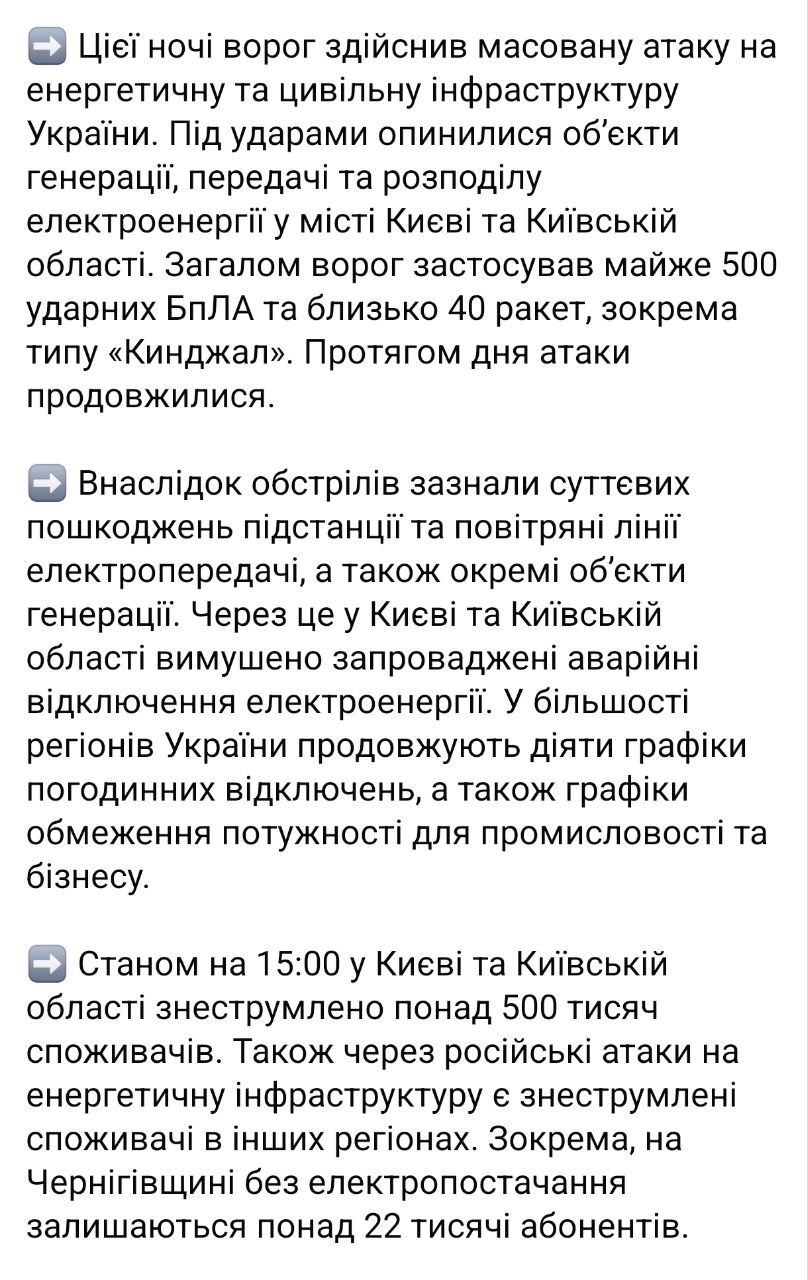 16:47 Минэнерго сообщает, что без электроснабжения в Киеве и Киевской области остаются более 500 тысяч абонентов.