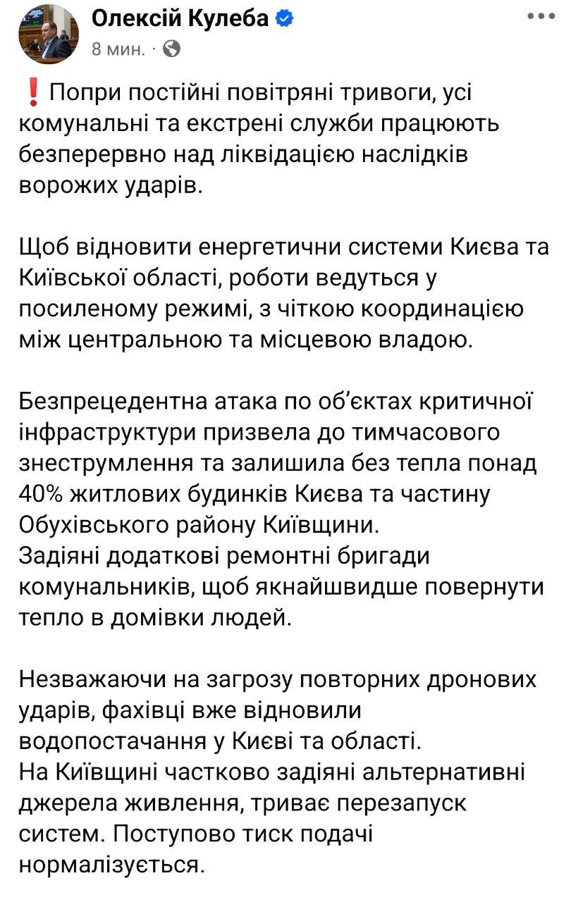 17:00 Более 40% жилых домов Киева и часть Обуховского района остались без света и тепла из-за атаки на объекты критической инфраструктуры, сообщил вице-премьер Кулеба.