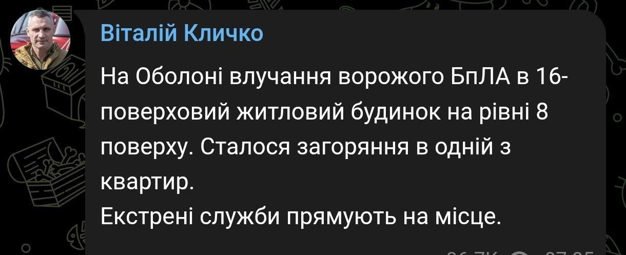 8.17 В Оболонском районе Киева беспилотник влетел в 16-этажный жилой дом на уровне восьмого этажа. Загорелась квартира, сообщил мэр города.