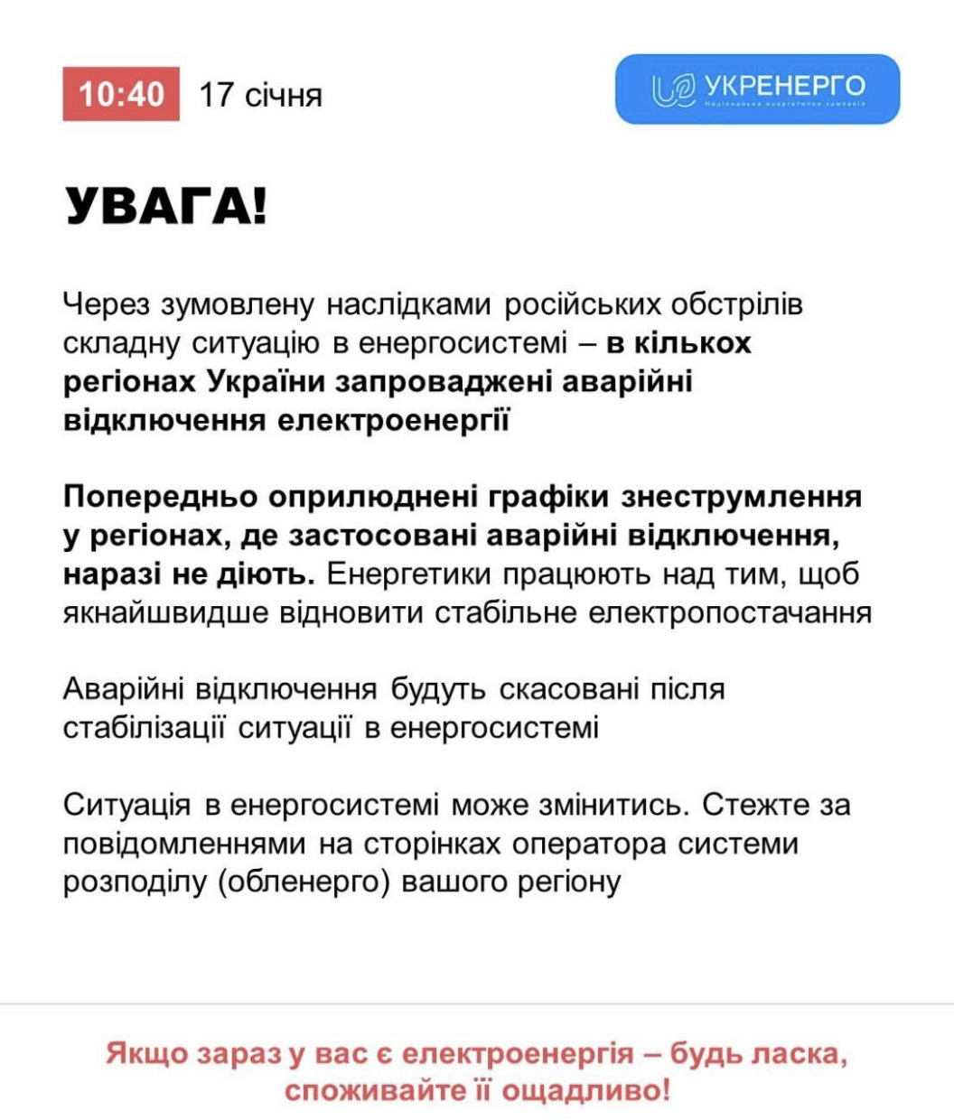 10:44 "Укрэнерго" сообщило о введении аварийных отключений в ряде регионов Украины - из-за сложной ситуации в энергосистеме после обстрелов.