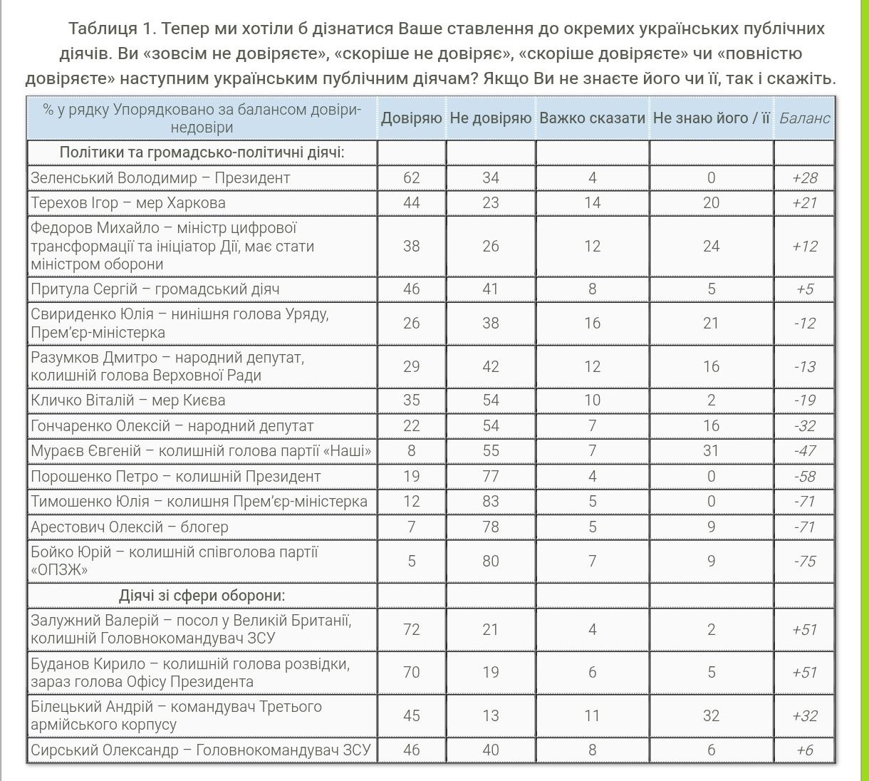 Согласно этим данным, Зеленскому доверяют 62% украинцев, в то время как экс-главкому и послу в Британии – 72%, а бывшему главе военной разведки и нынешнему руководителю Офиса президента – 70%.