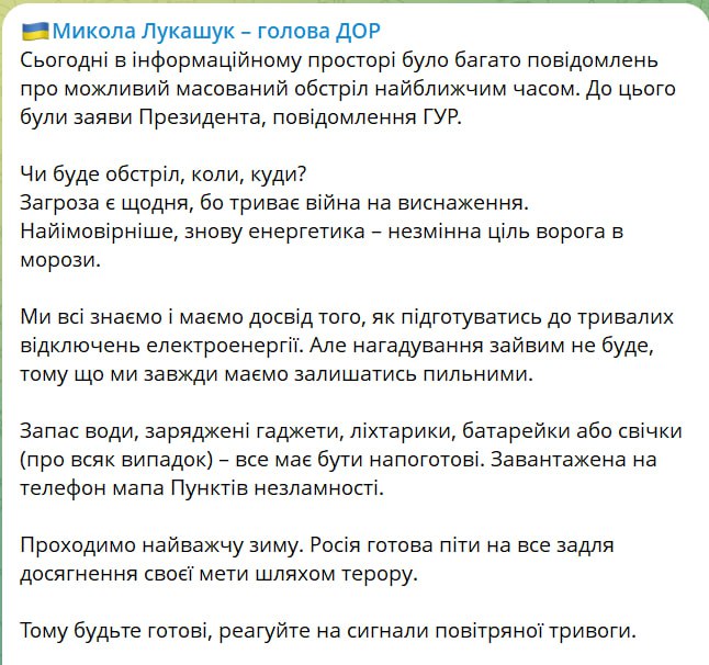 Кроме того, об угрозе массированного российского удара в ближайшие дни также пишет в своем телеграм-канале глава Днепропетровского областного совета Николай Лукашук.