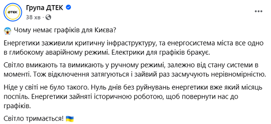 ДТЭК не может вернуть Киеву отключения по графикам, так как электричества для графиков не хватает, поэтому город живет в режиме аварийных отключений.