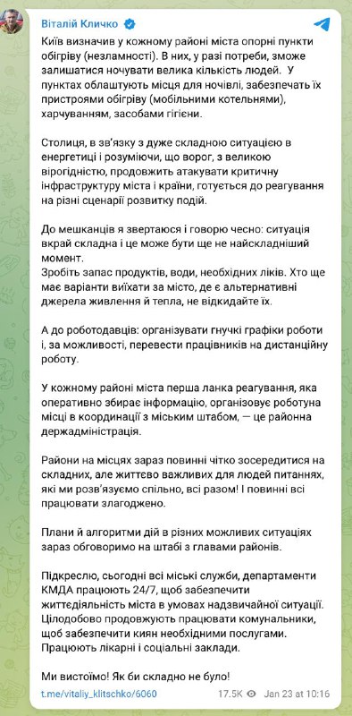 "Сделайте запас продуктов, воды, необходимых лекарств. Кто еще имеет варианты уехать за город, где есть альтернативные источники питания и тепла, не отбрасывайте их", - обратился Кличко к киевлянам.