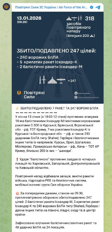 11.31 Воздушные силы ВСУ опровергают заявление эксперта Харченко о том, что киевские ТЭЦ 13 января атаковали 16 баллистических ракет. Спикер Игнат заявил, что в тот день в Киеве были прилеты только 2 баллистических ракет, остальные били по Харьковской, Запорожской, Днепропетровской и Киевской областям.