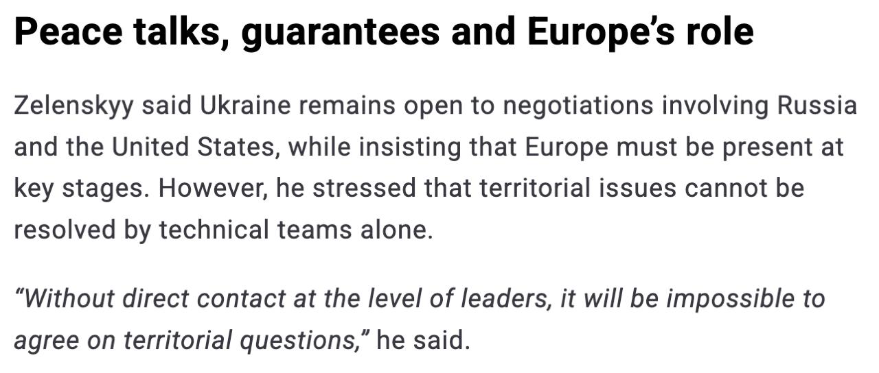 17:42 Зеленский повторил свой тезис, что вопросы территорий он готов обсуждать только с Путиным.