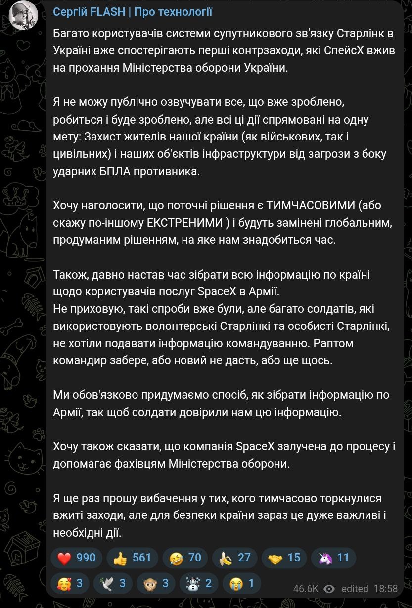 "Многие пользователи системы спутниковой связи Starlink в Украине уже наблюдают первые контрмеры, которые SpaceX предприняла по запросу Министерства обороны Украины", - заявил советник министра обороны Сергей Бескрестнов.