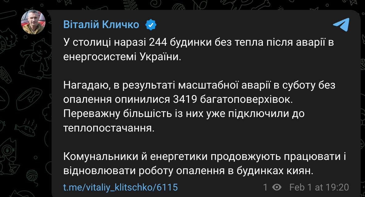 20:24 В Киеве сейчас 244 дома остаются без тепла после вчерашней аварии в энергосистеме, сообщил Кличко.