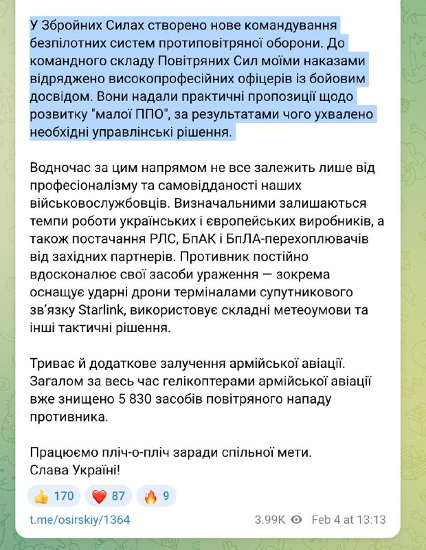 14.47 В ВСУ создано новое командование беспилотных систем противовоздушной обороны, сообщил главком Сырский. Уже сформирован их командный состав. Как сообщается, это высокопрофессиональные офицеры с боевым опытом, которые представили практические предложения по развитию "малой ПВО". Приняты соответствующие решения.