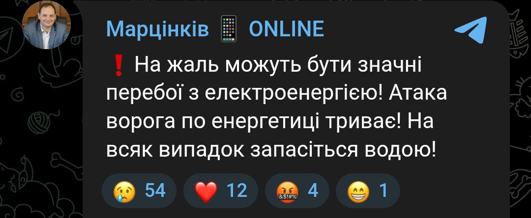 После сегодняшних ночных обстрелов "Украина потеряла значительную часть доступной электроэнергии".