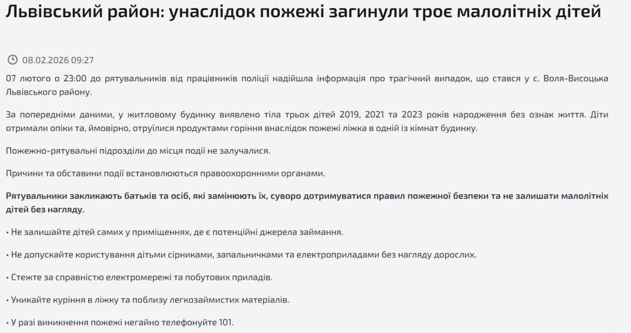 "07 февраля в 23:00 к спасателям от сотрудников полиции поступила информация о трагическом случае, произошедшем в с. Воля-Высоцкая Львовского района. По предварительным данным, в жилом доме обнаружены тела троих детей 2019, 2021 и 2023 годов рождения без признаков жизни. Дети получили ожоги и, вероятно, отравились продуктами горения в результате пожара кровати в одной из комнат дома", - говорится в заявлении.