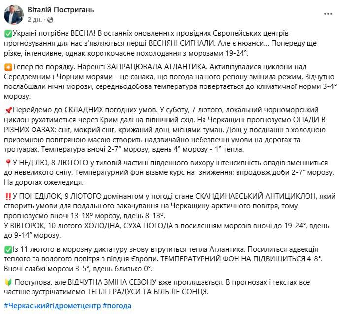 Во вторник, 10 февраля холодная, сухая погода с усилением морозов ночью до 19-24°, днем до 9-14° мороза. С 11 февраля в морозную диктатуру снова вмешается теплая Атлантика. Усилится адвекция теплого и влажного воздуха с юга Европы. Температурный фон повысится повысится 4-8°. Ночью слабые морозы 3-5°, днем около 0°", - пишет Постригань.