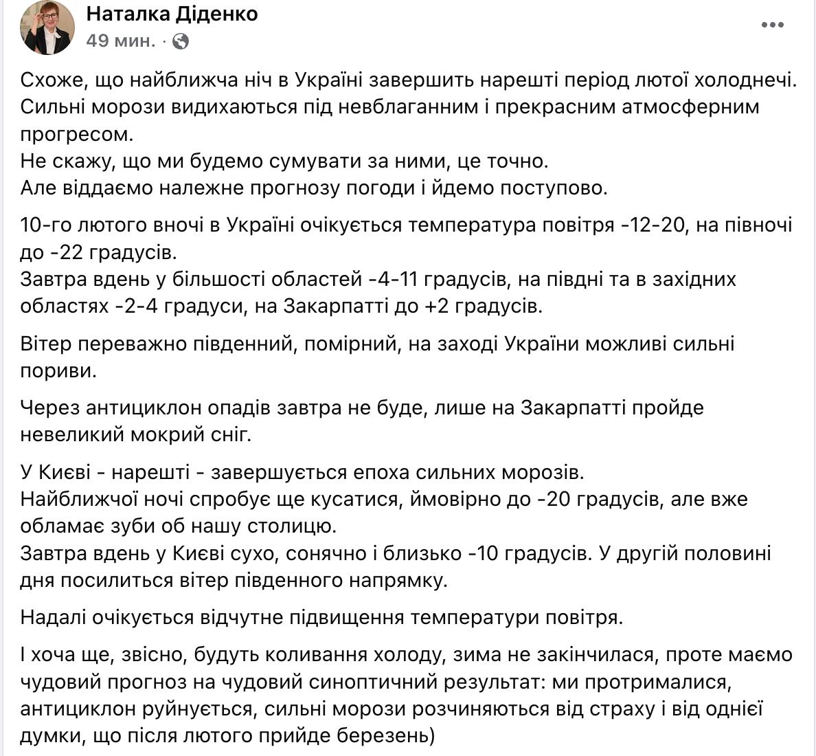 В Киеве наконец завершается эпоха сильных морозов. Ближайшей ночью ещё попробует кусаться, вероятно до -20 градусов, но уже обломает зубы об нашу столицу. Завтра днём в Киеве сухо, солнечно и около -10 градусов. Во второй половине дня усилится ветер южного направления", - написала синоптик.