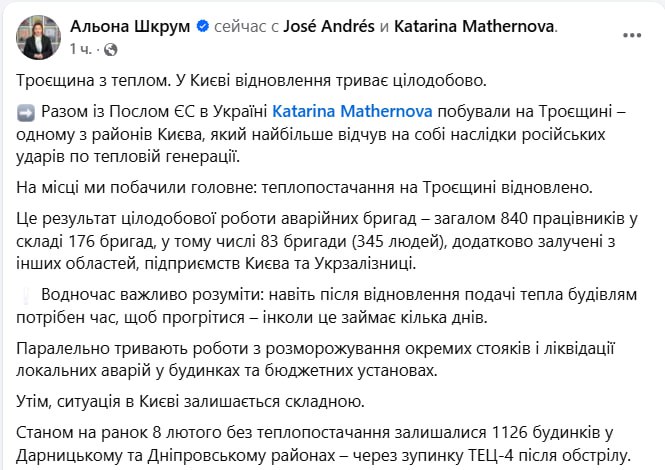 При этом Шкрум призвала жителей Троещины еще потерпеть, так как бетонным сооружениям нужно несколько дней, чтобы прогреться после длительного отключения, а в отдельных зданиях продолжается размораживание отдельных стоек и ликвидация порывов непосредственно внутри домов и бюджетных учреждений.