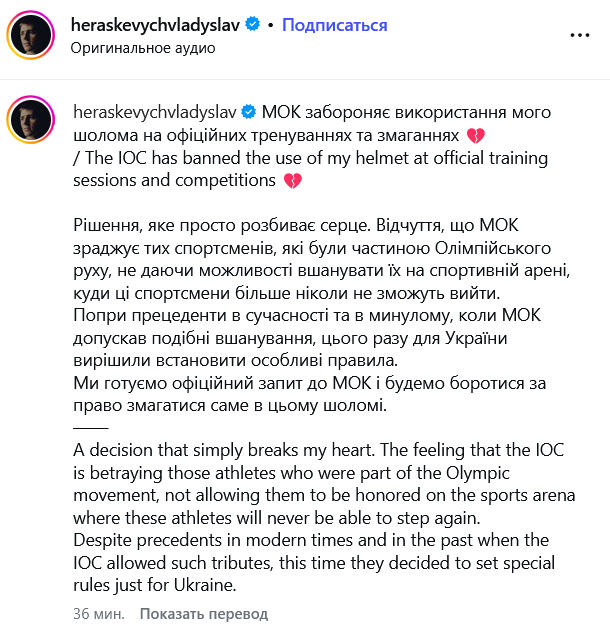 "Решение, которое просто разбивает сердце. Ощущение, что МОК изменяет спортсменам, которые были частью олимпийского движения, не давая возможности почтить их на спортивной арене, куда эти спортсмены больше никогда не смогут выйти. Несмотря на прецеденты в современности и в прошлом, когда МОК допускал подобные чествования, на этот раз для Украины решили установить особые правила", - написал Гераскевич.