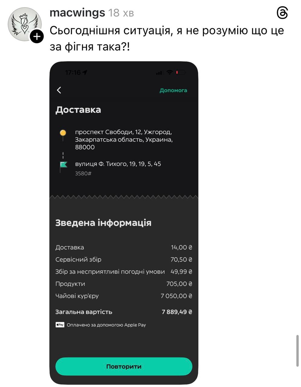 "Только что курьеру чаевые снялись 10 тыс. гривен вместо 100, поддержка не отвечает уже 30 минут!" - сообщают в комментариях.